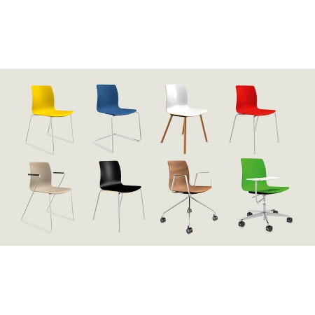Elle se décline avec des piètements différents: 4 pieds métal empilable, pieds traineau métal, 4 pieds bois, 4 pieds métal coniforme pivotant, 4 branches pivotant, 5 branches piston à gaz sur roulettes, tabouret 4 pieds métal, tabouret pivotant avec piston à gaz, sièges sur poutre.